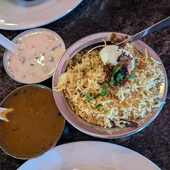 Heathy Indian dishes with different curries, rice, breads, and salads. An entire meal that honors local tastes in each bite.